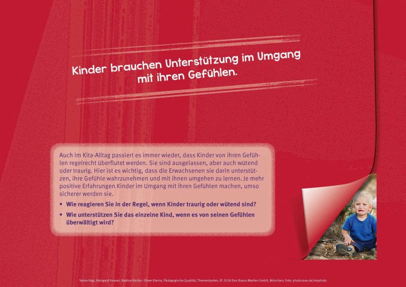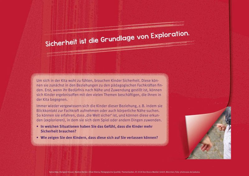 Was macht eigentlich eine gute Kita aus? Die Autor_innen zeigen in diesem Themenkartenset für Teamarbeit, Supervision und Fortbildung, dass Qualität aus dem Zusammenspiel von organisatorischen Rahmenbedingungen, fachlichen Kompetenzen, der Haltung der pädagogischen Fachkräfte und ihrer Interaktion mit den Kindern resultiert. Das Set enthält 30 kraftvolle Bildimpulse, anregende Leitfragen und Statements zu den Themen: wertschätzende Fachkraft-Kind-Interaktion, Lebensweltorientierung und Partizipation als Grundlage didaktischen Handelns, lebensweltorientierte didaktische Planung und ihre Umsetzung in pädagogisches Handeln sowie die Kita als lernende Organisation.
