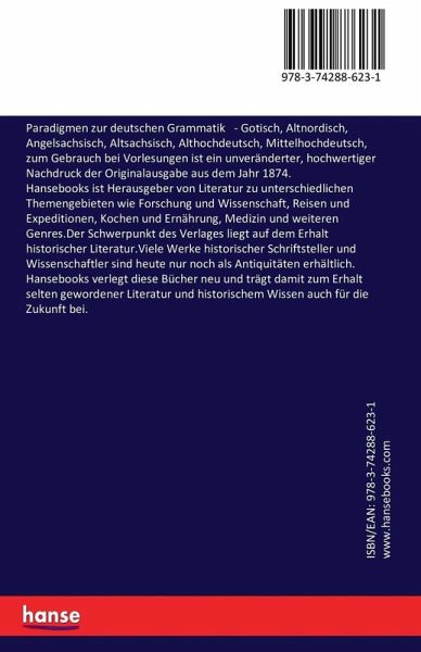 Paradigmen zur deutschen Grammatik - Gotisch, Altnordisch, Angelsachsisch, Altsachsisch, Althochdeutsch, Mittelhochdeutsch, zum Gebrauch bei Vorlesungen ist ein unveränderter, hochwertiger Nachdruck der Originalausgabe aus dem Jahr 1874.