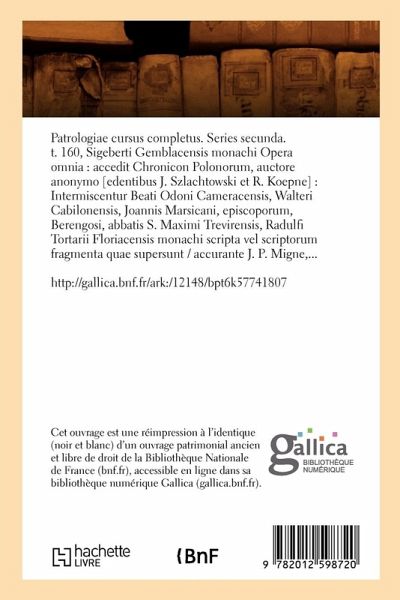 Patrologiae cursus completus. Series secunda. t. 160, Sigeberti Gemblacensis monachi Opera omnia: accedit Chronicon Polonorum, auctore anonymo [edentibus J. Szlachtowski et R. Koepne]: Intermiscentur Beati Odoni Cameracensis, Walteri Cabilonensis, Joannis Marsicani, episcoporum, Berengosi, abbatis S. Maximi Trevirensis, Radulfi Tortarii Floriacensis monachi scripta vel scriptorum fragmenta quae supersunt / accurante J. P. Migne, ...Date de l'edition originale: 1854Comprend: Chronicon polonorum; Odonis... episcopi cameracensis ecclesiae Opuscula sacra... [Expositio in canonem Missae. De Peccato originali. Disputatio contra judaeum de adventu Christi. De Blasphema in Spiritum sanctum. De Canonibus Evangeliorum. Homilia de villico iniquitatis. Diplomata.]Ce livre est la reproduction fidele d'une oeuvre publiee avant 1920 et fait partie d'une collection de livres reimprimes a la demande editee par Hachette Livre, dans le cadre d'un partenariat avec la Bibliotheque nationale de France, offrant l'opportunite d'acceder a des ouvrages anciens et souvent rares issus des fonds patrimoniaux de la BnF.Les oeuvres faisant partie de cette collection ont ete numerisees par la BnF et sont presentes sur Gallica, sa bibliotheque numerique.En entreprenant de redonner vie a ces ouvrages au travers d'une collection de livres reimprimes a la demande, nous leur donnons la possibilite de rencontrer un public elargi et participons a la transmission de connaissances et de savoirs parfois difficilement accessibles.Nous avons cherche a concilier la reproduction fidele d'un livre ancien a partir de sa version numerisee avec le souci d'un confort de lecture optimal. Nous esperons que les ouvrages de cette nouvelle collection vous apporteront entiere satisfaction.Pour plus d'informations, rendez-vous sur www.hachettebnf.frhttp: //gallica.bnf.fr/ark: /12148/bpt6k57741807