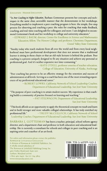 The purpose of peer coaching is to attain student success. My experience is that coaching builds a community of practice focused on learning and teaching. -- Pat Stelwagon, educational leadership faculty, San Jose State University Peer coaching has proven to be an effective strategy for the retention and success of administrators at all levels. Serving as a coach has been one of the most rewarding experiences of my professional educational career. -- Robert Lowry, educational leadership faculty, San Jose State University, California Network of School Leadership Coaches Faculty today who teach students from all over the world and from every local neighborhood, must have professional development that does not assume a traditional learner is sitting in those chairs or an old-style lecturer is behind the podium. Peer Coaching is a process uniquely designed to fit any situation and achieve any personal or professional goal. And it's neither expensive nor time-consuming. -- Kate O'Dell, professor emerita of teacher education, College of Education, University of Alaska, Anchorage In Peer Coaching in Higher Education, Barbara Gottesman presents her concepts and techniques in the same clear, accessible manner she demonstrates in her workshops. Everything needed to implement a peer coaching program is here: the simple, five-step process for observing and coaching a peer, the rules for coaching that make feedback, coaching, and real-time coaching safe for colleagues, and more. I am delighted to recommend Gottesman's book and her workshop to college and university educators. -- Edward J. Baum, director, Center for Excellence in Science and Mathematics Education, fellow, The Honors College, and professor, Chemistry Depar This book affords us an opportunity to apply the theoretical concepts we teach and learn and to build stronger and more valuable collegial relationships. It has truly enriched my professional life. -- Trudy McCulloch, California Network of School Leadership Coaches, Educational Leadership faculty, San Jose State University