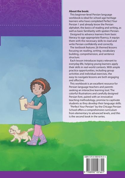 This beginner-level Persian language workbook is ideal for school-age heritage learners who have completed Perfect Your Persian 1 and already know the Persian alphabet, the basics of reading and writing, as well as basic familiarity with spoken Persian. Designed to advance learners from basic literacy to age-appropriate fluency, it equips them with the necessary skills to read and write Persian confidently and correctly. The textbook is organized into 26 meticulously designed lessons that focus on Persian reading and writing, with a special emphasis on vocabulary building, comprehension, and sentence structure. Lesson contents introduce topics relevant to everyday life, helping young learners apply their reading and writing skills in real-world contexts. Each lesson is followed by ample practice opportunities that offer both group learning activities and individual exercises. This workbook is an excellent resource for Persian language teachers and parents seeking an interactive learning tool. The colorful illustrations and carefully designed Persian font, paired with an innovative teaching methodology, promise to captivate students as they develop their language skills. "Perfect Your Persian" by the Chicago Persian School offers a comprehensive curriculum from elementary to advanced levels, and this is the second book in the series. This textbook represents the culmination of years of collaboration, innovation, and exploration by the dedicated Persian language educators at the Chicago Persian School.