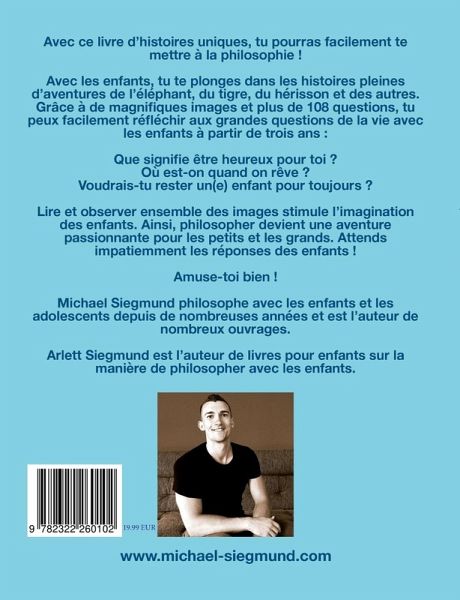 Avec ce livre d'histoires uniques, tu pourras facilement te mettre à la philosophie !Avec les enfants, tu te plonges dans les histoires pleines d'aventures de l'éléphant, du tigre, du hérisson et des autres. Grâce à de magnifiques images et plus de 108 questions, tu peux facilement réfléchir aux grandes questions de la vie avec les enfants à partir de trois ans :Que signifie être heureux pour toi ?Où est-on quand on rêve ?Voudrais-tu rester un(e) enfant pour toujours ?Lire et observer ensemble des images stimule l'imagination des enfants. Ainsi, philosopher devient une aventure passionnante pour les petits et les grands. Attends impatiemment les réponses des enfants !Amuse-toi bien !
