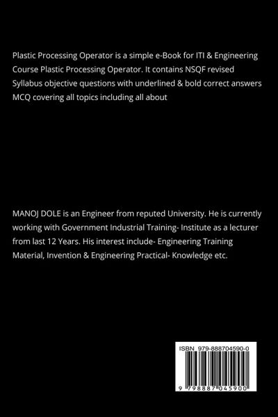 Plastic Processing Operator is a simple Book for ITI & Engineering Course Plastic Processing Operator. It contains NSQF revised Syllabus objective questions with underlined & bold correct answers MCQ covering all topics including all about safety and environment, use of fire extinguishers, trade tools & its standardization, Familiarize with basic fitting, basic of electricity, identification of plastics, injection moulding and compression moulding, hydraulic circuits, Blow moulding, extrusion and thermoforming, rotational moulding process, Pneumatic circuits, plastic and predrying process, and lots more.