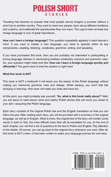 If you're looking to learn Polish fast through simple and captivating stories, then keep reading... How can I learn a foreign language? This question repeatedly appears in each learner's mind. If you want to master a new language, you need to operate within its key components-reading, listening, vocabulary, grammar, writing, and speaking. If you have thoughts about getting this book, then you are probably not interested in participating in boring language classes or memorizing endless vocabulary columns and grammar rules. So, your question might really look like: How can I learn a foreign language quickly and efficiently? The good news is that the solution is right here! In Polish Short Stories: 11 Simple Stories for Beginners Who Want to Learn Polish in Less Time While Also Having Fun, you will encounter rich and new but not too complex vocabulary, which is translated at the end of the chapter, avoiding the hassle of having to stop the reading rhythm to look up every word in the dictionary. Every paragraph is translated, as well as the summary of the story, thus providing a clearer comprehension of each sentence, while trying to prevent the temptation that the reader might have, if discouraged, of giving up and reading the whole story in English. After each chapter, there is a question section, which aims to test the reader's overall understanding of the story, containing both open-ended and multiple-choice questions. The solved questions are provided at the end, enabling you to check your own answers and, consequently, develop your skills. So if you want to learn Polish while having fun, scroll up and click the "add to cart" button!