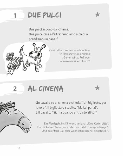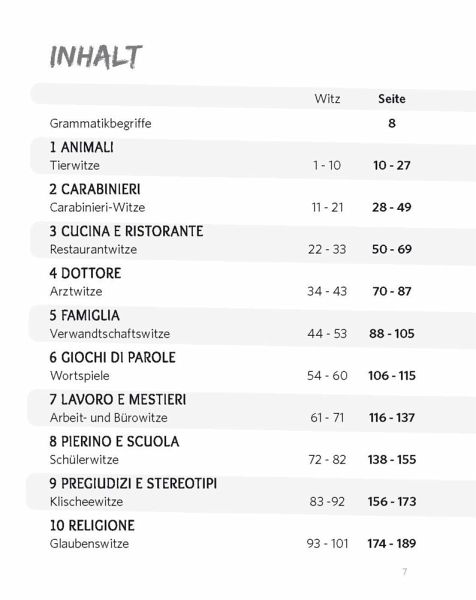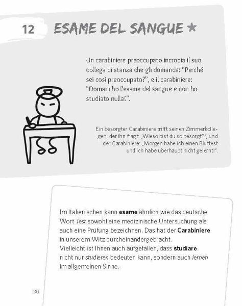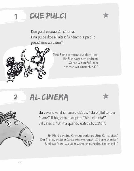101 Witze und Wortspiele mit ÜbersetzungMit lustigen Illustrationen und CartoonsÜbungen zu Grammatik und Wortschatz in 3 SchwierigkeitsgradenHumorvoller Einblick in die italienische Sprache und Kultur. Spielerisch leicht eine Sprache lernen und üben. Wäre doch gelacht, wenn das nicht klappt!Niveau A2-B2: Für elementare Grundkenntnisse bis moderate Sprachkenntnisse