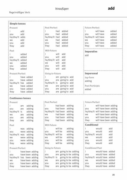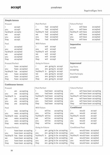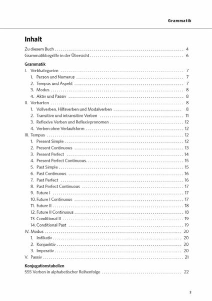Die 555 wichtigsten englischen Verben, alphabetisch sortiert.Alle Verbgruppen berücksichtigt: unregelmäßige und regelmäßige Verben, Modalverben, reflexive Verben ...Jedes Verb komplett konjugiert: mit allen Formen und in allen Zeiten.Übersetzung aller Verben ins Deutsche.