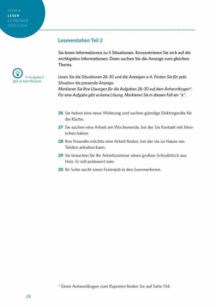 Drei vollständige Modelltests mit Audio-Aufnahmen und ausführlichen Lösungen.Alle Test-Aufgaben werden schrittweise erklärt, mit Tipps zur Vorbereitung.Praktische Informationen zur Prüfung.Mit Wortschatztraining zu allen wichtigen Themen.Das Audiomaterial finden Sie ganz praktisch Seite für Seite in der Scan2Learn-App!Niveau A2-B1: Elementare Grundkenntnisse bis moderate Sprachkenntnisse