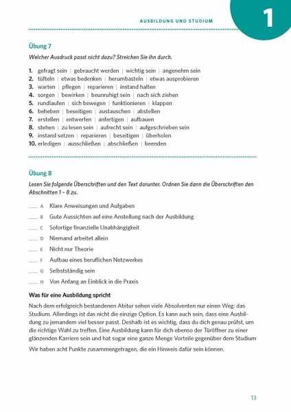 Sie trainieren alle gängigen Prüfungsformate der B2-Prüfungen und gehen damit optimal vorbereitet in die Prüfung.Sie lernen B2-relevante Themen wie Ausbildung, Bewerbung, Umwelt, Verkehr, Pflege, Medizin, Digitalisierung u. a. sowie den entsprechenden Wortschatz.Mit ausführlichem Modelltest.Extra Tipps zu kniffligen Grammatikthemen.Das Audiomaterial zum Aussprachetraining finden Sie ganz praktisch Seite für Seite in der Scan2Learn-App!Niveau B2: Fortgeschrittene Sprachkenntnisse