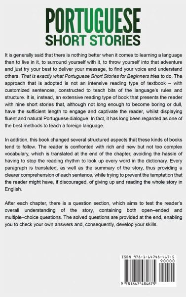 A Fun and Excellent Way to Learn Portuguese It is generally said that there is nothing better when it comes to learning a language than to live in it, to surround yourself with it, to throw yourself into that adventure and just try your best to deliver your message, to find your voice and understand others. That is exactly what Portuguese Short Stories for Beginners tries to do. The approach that is adopted is not an intensive reading type of textbook – with customized sentences, constructed to teach bits of the language’s rules and structure. It is, instead, an extensive reading type of book that presents the reader with nine short stories that, although not long enough to become boring or dull, have the sufficient length to engage and captivate the reader, whilst displaying fluent and natural Portuguese dialogue. In fact, it has long been regarded as one of the best methods to teach a foreign language. In addition, this book changed several structured aspects that these kinds of books tend to follow. The reader is confronted with rich and new but not too complex vocabulary, which is translated at the end of the chapter, avoiding the hassle of having to stop the reading rhythm to look up every word in the dictionary. Every paragraph is translated, as well as the summary of the story, thus providing a clearer comprehension of each sentence, while trying to prevent the temptation that the reader might have, if discouraged, of giving up and reading the whole story in English. After each chapter, there is a question section, which aims to test the reader’s overall understanding of the story, containing both open-ended and multiple-choice questions. The solved questions are provided at the end, enabling you to check your own answers and, consequently, develop your skills. Get this magnificent book now to learn Portuguese in a fun way!