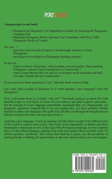 If you would like a faster approach to learning the Portuguese language compared to more traditional methods, then keep reading... Two manuscripts in one book:Portuguese for Beginners: A Comprehensive Guide for Learning the Portuguese Language Fast Mastering Portuguese Words: Increase Your Vocabulary with Over 3,000 Portuguese Words in Context Are you quite busy and in need of a precise, but thorough, resource to learn Portuguese? Are you traveling to or working in a Portuguese-speaking country? Do you want to connect with people, while keeping your personality when speaking Portuguese, instead of just learning how to "tourist-talk"? Do you want to learn phrases that you can use to navigate social situations and help you make friends and new connections? If your answer to these questions is "yes," then this book is here to help. Learning a new language is such an amazing tool that allows people from different parts of the world to connect more easily. That leads, more importantly, to deeper and more meaningful connections as well. In the case of the Portuguese language, several countries have it as the official language, making it the sixth most spoken idiom on Earth, with 170 million speakers worldwide. This means that learning it grants you the possibility of making friends or finding job opportunities in the most obscure places you can imagine. Part one of this book is divided into three parts:The Very Basics Grammar Conversation You'll also find many fun quizzes throughout the book that will allow you to practice your skills. Part two of this book will present you with over 3,000 Portuguese words, which are the most frequently used in Portuguese. But instead of making a plain list, the words will be allocated to different categories so that it is easier to organize them in your mind, as they are taught within a specific group of words. Each word will also be used in a sentence and then translated into English to make sure it is well understood. So if you want to learn Portuguese fast, then scroll up and click the "add to cart" button!