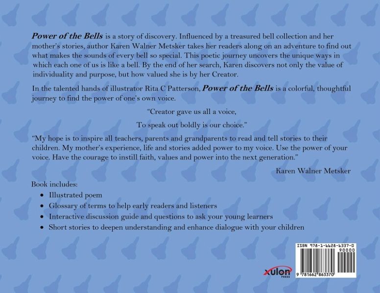 Influenced by a treasured bell collection, author, Karen Walner Metsker, ventures out to find what makes the sound of every bell so special. She uncovers the unique ways in which each one of us is like a bell. Together adults and children will discover unique individuality, divine purpose and great value given by their creator. Power of the Bells includes, inspirational poem, illustrated glossary, interactive discussion guide and short stories to deepen understanding.