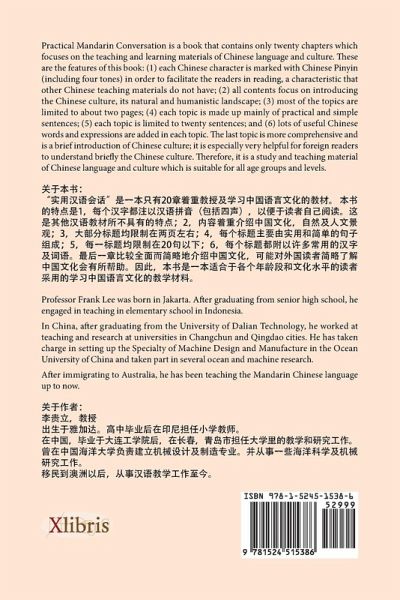 Practical Mandarin Conversation is a book that contains only twenty chapters which focuses on the teaching and learning materials of Chinese language and culture. These are the features of this book: (1) each Chinese character is marked with Chinese Pinyin (including four tones) in order to facilitate the readers in reading, a characteristic that other Chinese teaching materials do not have; (2) all contents focus on introducing the Chinese culture, its natural and humanistic landscape; (3) most of the topics are limited to about two pages; (4) each topic is made up mainly of practical and simple sentences; (5) each topic is limited to twenty sentences; and (6) lots of useful Chinese words and expressions are added in each topic. The last topic is more comprehensive and is a brief introduction of Chinese culture; it is especially very helpful for foreign readers to understand briefly the Chinese culture. Therefore, it is a study and teaching material of Chinese language and culture which is suitable for all age groups and levels.