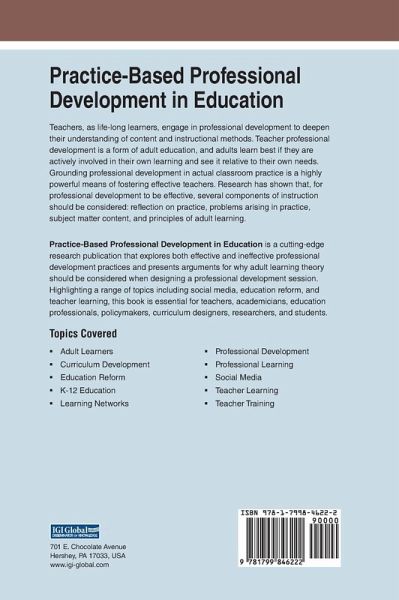 Teachers, as life-long learners, engage in professional development to deepen their understanding of content and instructional methods. Teacher professional development is a form of adult education, and adults learn best if they are actively involved in their own learning and see it relative to their own needs. Grounding professional development in actual classroom practice is a highly powerful means of fostering effective teachers. Research has shown that, for professional development to be effective, several components of instruction should be considered: reflection on practice, problems arising in practice, subject matter content, and principles of adult learning. Practice-Based Professional Development in Education is a cutting-edge research publication that explores both effective and ineffective professional development practices and presents arguments for why adult learning theory should be considered when designing a professional development session. Highlighting a range of topics including social media, education reform, and teacher learning, this book is essential for teachers, academicians, education professionals, policymakers, curriculum designers, researchers, and students.