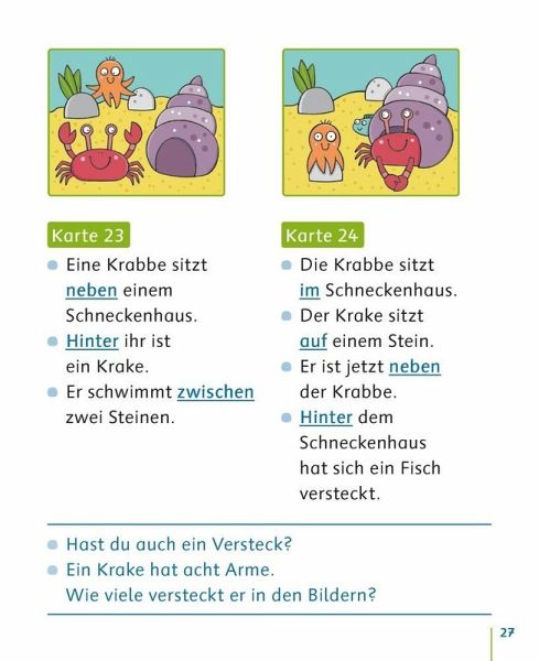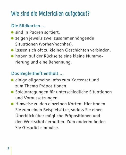 Bildkarten zur Sprachförderung für Kita, Kindergarten und erstes Schuljahr, geeignet für Kinder ab 3 Jahren +++ Über, unter, neben, hinter - mit diesen lustigen und motivierenden Bildkarten zur Sprachförderung üben die Kinder spielerisch, aber ganz gezielt die Benennung von Präpositionen. Je zwei Motive, die Ortsangaben darstellen, lassen sich von den Kindern zu einer Bildfolge zusammenlegen. Ob einzeln, zu zweit oder in der ganzen Gruppe - zahlreiche Spielideen ermöglichen einen vielfältigen Einsatz der Bildkarten. Ideal zur Sprachförderung in Kindergarten, Grundschule und DaZ. Inkl. Bildkarten als Malvorlagen zum Download mit weiterführenden Ideen.Informationen zur Reihe:Sprache gezielt fördern, um allen Kindern die gleichen Voraussetzungen für einen erfolgreichen Schulstart zu ermöglichen: Mit diesen Bildkartensets erweitern die Kinder spielerisch und kindgemäß ihre sprachlichen Ausdrucksmöglichkeiten und trainieren zugleich auch die visuelle Wahrnehmung. Wortschatzarbeit, Syntaxschulung oder kreative Erzählanlässe - die Karten sind vielfältig einsetzbar und decken alle Sprachförderbereiche ab.