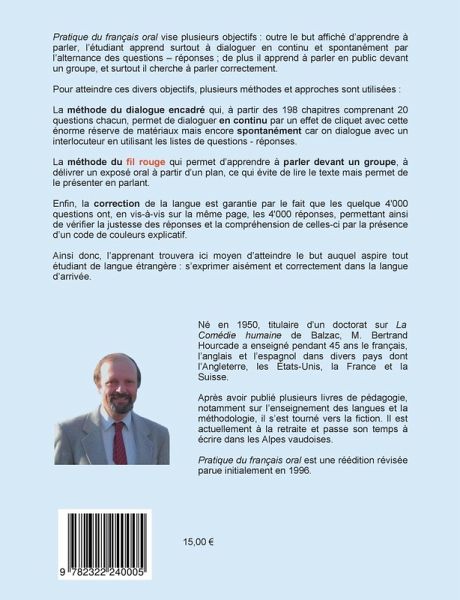 Pratique du français oral vise plusieurs objectifs : outre le but affiché d'apprendre à parler, l'étudiant apprend surtout à dialoguer en continu et spontanément par l'alternance des questions - réponses ; de plus il apprend à parler en public devant un groupe, et surtout il cherche à parler correctement.Pour atteindre ces objectifs, on utilise la méthode du dialogue encadré pour s'entraîner à la conversation et la méthode du fil rouge pour s'entraîner à l'exposé oral.Avec 4'000 questions et autant de réponses, ce livre permet aussi à l'apprenant de contrôler la qualité de sa langue et de viser à parler le plus correctement possible.