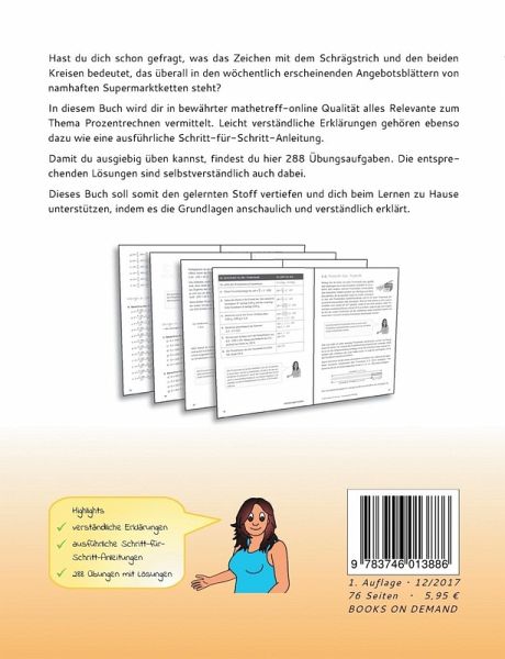 Hast du dich schon gefragt, was das Zeichen mit dem Schrägstrich und den beiden Kreisen bedeutet, das überall in den wöchentlich erscheinenden Angebotsblättern von namhaften Supermarktketten steht? In diesem Buch wird dir in bewährter mathetreff-online Qualität alles Relevante zum Thema Prozentrechnen vermittelt. Leicht verständliche Erklärungen gehören ebenso dazu wie eine ausführliche Schritt-für-Schritt-Anleitung. Damit du ausgiebig üben kannst, findest du hier 288 Übungsaufgaben. Die entsprechenden Lösungen sind selbstverständlich auch dabei. Dieses Buch soll somit den gelernten Stoff vertiefen und dich beim Lernen zu Hause unterstützen, indem es die Grundlagen anschaulich und verständlich erklärt. Highlights: - verständliche Erklärungen - ausführliche Schritt-für-Schritt-Anleitungen - 288 Übungen mit Lösungen