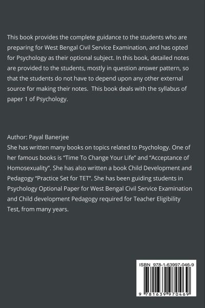 This book provides the complete guidance to the students who are preparing for West Bengal Civil Service Examination, and has opted for Psychology as their optional subject. In this book, detailed notes are provided to the students, mostly in question answer pattern, so that the students do not have to depend upon any other external source for making their notes. As optional paper in WBCS exam is a descriptive one, so the answer writing pattern is very important. Generally, the students face difficulty in writing and formation of answer, this book is a solution to that. Since, there are two papers in optional subject. This book deals with the syllabus of paper 1 of Psychology. Each and every chapter with complete explanation is given in this book. Also, the students face difficulty in buying a number of books, as no single book covers the complete syllabus. This problem is also solved, as this single book will cover the complete notes regarding paper 1 of Psychology as optional paper.