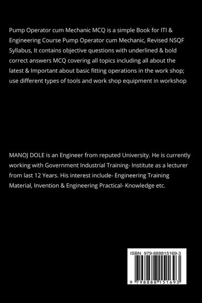 Pump Operator cum Mechanic MCQ is a simple Book for ITI & Engineering Course Pump Operator cum Mechanic, Revised NSQF Syllabus, It contains objective questions with underlined & bold correct answers MCQ covering all topics including all about the latest & Important about basic fitting operations in the work shop; use different types of tools and work shop equipment in workshop; perform precision measurements on the components and compare parameters with specifications used in work shop practices. He/ she is able to use different type of fastening and locking devices in a in Diesel Engine; cutting tools in the work shop following safety precautions while grinding; perform basic fitting operations used in the work shop practices and inspection of dimensions; produce sheet metal components using various sheet metal operations; perform basic electrical testing in a in Diesel Engine; perform battery testing and charging operations