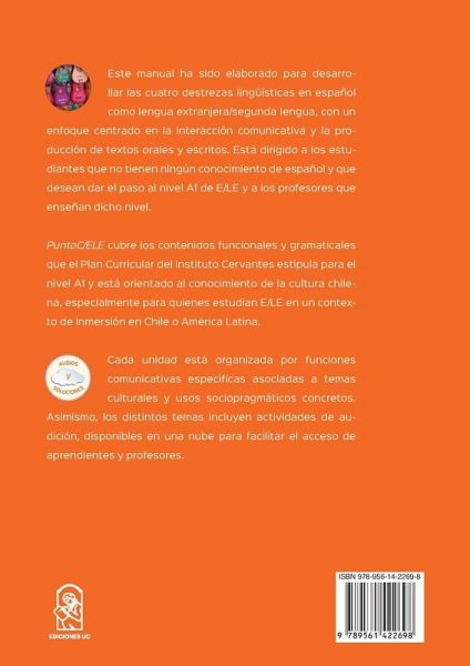 Este manual ha sido elaborado para desarrollar las cuatro destrezas lingüísticas en español como lengua extranjera/segunda lengua, con un enfoque centrado en la interacción comunicativa y la producción de textos orales y escritos. Está dirigido a los estudiantes que no tienen ningún conocimiento de español y que desean dar el paso al nivel A1 de E/LE y a los profesores que enseñan dicho nivel. Punto C/ELE cubre los contenidos funcionales y gramaticales que el Plan Curricular del Instituto Cervantes estipula para el nivel A1 y está orientado al conocimiento de la cultura chilena, especialmente para quienes estudian E/LE en un contexto de inmersión en Chile o América Latina. Cada unidad está organizada por funciones comunicativas específicas asociadas a temas culturales y usos sociopragmáticos concretos. Asimismo, los distintos temas incluyen actividades de audición, disponibles en una nube para facilitar el acceso de aprendientes y profesores.