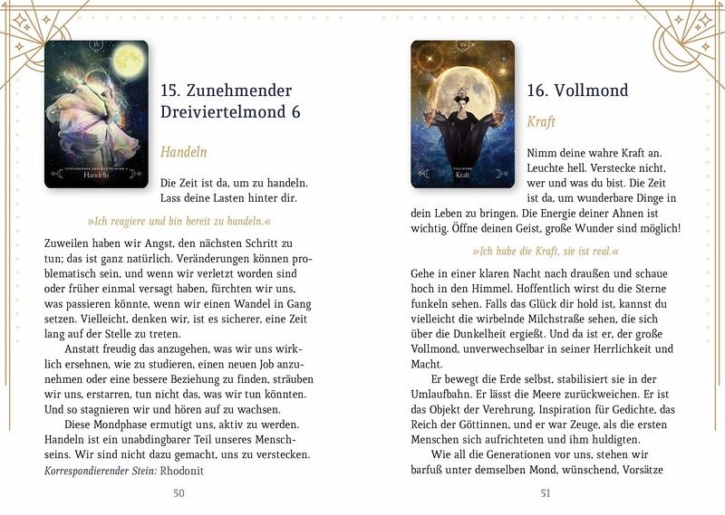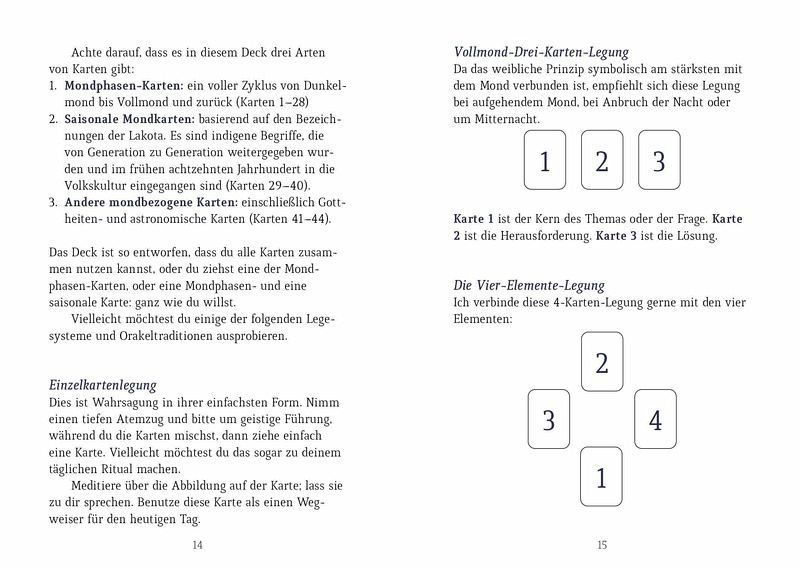 Mit den Karten lässt sich ein kompletter Mondzyklus legen. Dabei lernst du die unterschiedlichen Qualitäten der Mondphasen kennen und welche sich am besten für welches magische Ritual eignet. Ebenso wird die Mondenergie im Wandel der Jahreszeiten und der zwölf Monate dargestellt und erfahrbar gemacht.