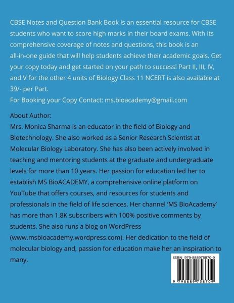 Introducing the ultimate guide for CBSE exam preparation - CBSE Notes and Question Bank Book! This comprehensive guide is designed to help students in their preparation for the CBSE board exams. The book contains a comprehensive collection of notes, and questions-answers for Biology subject for Class 11. This book has been specifically designed to meet the needs of CBSE students preparing for their board exams. The notes in this book are concise and well-organized, making it easier for students to understand the concepts and remember them for a longer time. Each chapter in the book contains detailed notes that cover all the important topics and concepts. The book also includes a comprehensive collection of questions that cover all types of questions that can be asked in the CBSE board exams. This book is an invaluable resource for CBSE students as it not only helps them prepare for the board exams but also helps them understand the subject in-depth, making it easier for them to score well in the exams. The book is written in an easy-to-understand language, making it accessible to all students, regardless of their proficiency level. In summary, CBSE Notes and Question Bank Book is an essential resource for CBSE students who want to score high marks in their board exams. With its comprehensive coverage of notes and questions, this book is an all-in-one guide that will help students achieve their academic goals. For Booking your Copy Contact: ms.bioacademy@gmail.com