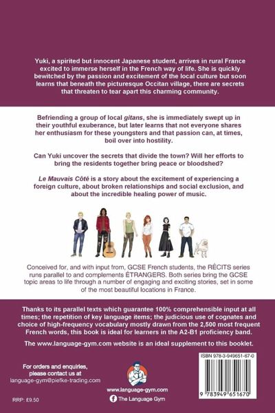 Yuki, a spirited but innocent Japanese student, arrives in rural France excited to immerse herself in the French way of life. She is quickly bewitched by the passion and excitement of the local culture but soon learns that beneath the picturesque Occitan village, there are secrets that threaten to tear apart this charming community. Befriending a group of local gitans, she is immediately swept up in their youthful exuberance, but later learns that not everyone shares her enthusiasm for these youngsters and that passion can, at times, boil over into hostility. Can Yuki uncover the secrets that divide the town? Will her efforts to bring the residents together bring peace or bloodshed? Le Mauvais Côté is a story about the excitement of experiencing a foreign culture, about broken relationships and social exclusion, and about the incredible healing power of music. Conceived for, and with input from, GCSE French students, the RÉCITS series runs parallel to and complements ÉTRANGERS. Both series bring the GCSE topic areas to life through a number of engaging and exciting stories, set in some of the most beautiful locations in France. For orders and enquiries, please contact us at language-gym@piefke-trading.com Thanks to its parallel texts which guarantee 100% comprehensible input at all times; the repetition of key language items; the judicious use of cognates and choice of high-frequency vocabulary mostly drawn from the 2,500 most frequent French words, this book is ideal for learners in the A2-B1 proficiency band. The www.language-gym.com website is an ideal supplement to this booklet.