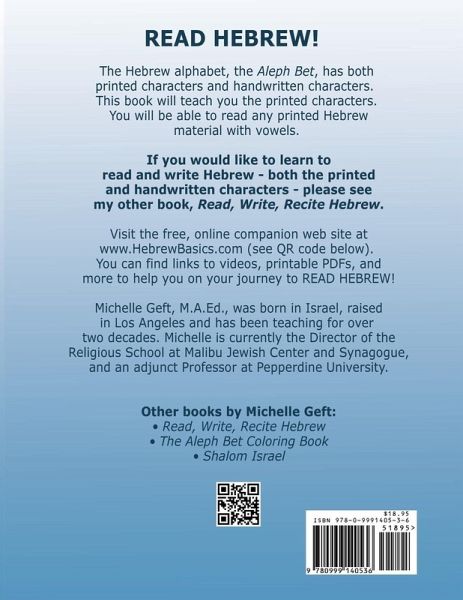 The Hebrew alphabet has printed characters and handwritten characters, this book will teach you the printed characters. You will be able to read any printed Hebrew material with vowels, including the Torah, Bible, books, newspapers and more. Visit the free online companion at www.HebrewBasics.com If you would like to learn to read and write Hebrew (both the printed and handwritten characters) please see my other book Read, Write, Recite Hebrew. READ HEBREW! is a recreation from Read, Write, Recite Hebrew to accommodate institutions and people who simply want to learn to read the printed alphabet. Michelle Geft is an artist and a teacher with over twenty years of teaching experience. Unable to find materials to teach Hebrew in a system that satisfied her, she made her own. Michelle teaches in many different scholastic settings including universities, after-school programs, home schools and privately. She is also the author of Read, Write, Recite Hebrew, The Aleph Bet Coloring Book and Shalom Israel. Please visit www.HebrewBasics.com to take advantage of free video companions and printable materials.