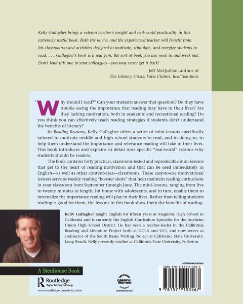 In Reading Reasons: Motivational Mini-Lessons for Middle and High School, author and teacher Kelly Gallagher offers a series of mini-lessons specifically tailored to motivate middle and high school students to read, and in doing so, to help them understand the importance and relevance reading will take in their lives.
