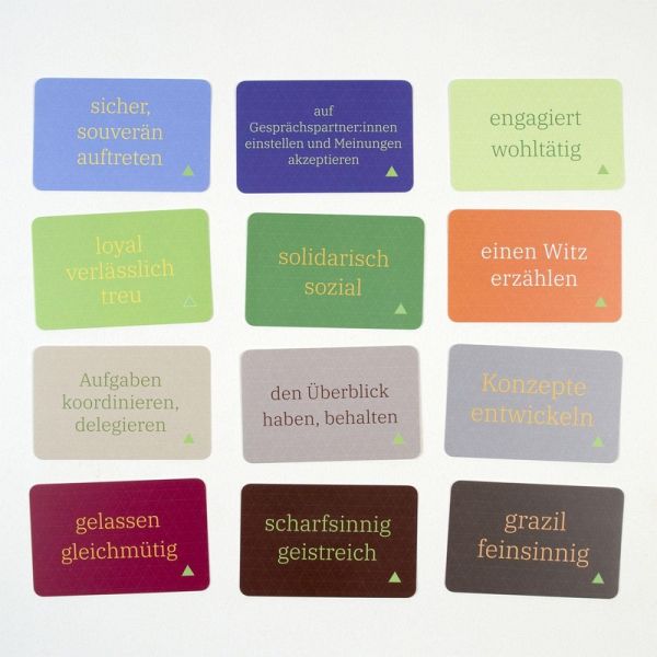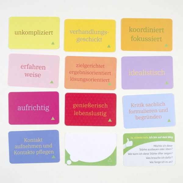 Spielend leicht die Fülle der Starken und Kompetenzen entdecken-Veranschaulicht die Vielzahl von persönlichen Stärken und Fähigkeiten-Schafft eine Atmosphäre der Wertschätzung und stärkt die Beziehung zu anderen-Begleitet Entwicklungs- und WachstumsprozesseDie Ressourcen- und Zielewerkstatt für Therapie und Beratung bietet 140 stärkende Kartenimpulse für Erwachsene und Jugendliche. Dabei geht es darum, Stärken zu benennen, Komplimente zu schenken und Ziele zu finden.Stärken als Fundament für persönliches WachstumDas interaktive Kartenset stärkt das Selbstbewusstsein, das Selbstwertgefühl und das Selbstvertrauen. Es benennt mehr als 234 Beispiele für Stärken, Anlässe zur Wertschätzung und Ziele. Die Karten lenken den Fokus von der Problemsicht zur Fülle der stärkenden, aufbauenden Ressourcen und Möglichkeiten. Das Booklet beinhaltet Anwendungsvarianten und 33 einfache, wirkungsvolle Übungen zum Entdecken und Weiterentwickeln eigener Stärken und um Ziele zu finden und zu erreichen.Spielfreude, Begeisterung und neue Sichtweisen kommen dabei nicht zu kurz.-Für Einzel- und Gruppensetting geeignet-Für den Altersbereich 16-99 Jahre-Mit 3 Sortierkarten sowie 3 Karten zum Selbstbeschriften für einen individuellen Einsatzhttps://www.gruenerpeter.com