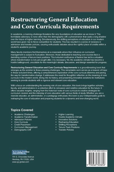 In academia, a looming challenge threatens the very foundations of education as we know it. This formidable adversary is none other than the demographic cliff, a phenomenon that casts a long shadow over the future of higher learning. Simultaneously, the shifting perceptions of education in our modern world have given rise to fierce competition for students. This has resulted in a series of revisions in admission and transfer policies, causing enthusiastic debates about the rightful place of credits within a student's academic journey. Restructuring General Education and Core Curricula Requirements is a groundbreaking book that emerges as the solution to these pressing challenges. This remarkable work serves as a beacon of hope in these turbulent times, offering a comprehensive exploration of the core curricula dilemma and paving the way for transformative change. It addresses the need for thoughtful reflection on the meaning of core curricula in the modern world, diving into its history, and presenting innovative solutions for institutions seeking to provide students with a rigorous and relevant core education.