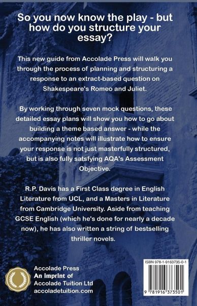 So you now know the play - but how do you structure your essay? This clean & simple new guide from Accolade Press will walk you through how to plan and structure essay responses to questions on Shakespeare's Romeo and Juliet. By working through seven mock questions, these detailed essay plans will show you how to go about building a theme based answer - while the accompanying notes will illustrate not only how to masterfully structure your response, but also how to ensure all AQA's Assessment Objectives are being satisfied. R.P. Davis has a First Class degree in English Literature from UCL, and a Masters in Literature from Cambridge University. Aside from teaching GCSE English (which he's done for nearly a decade now), he has also written a string of bestselling thriller novels.