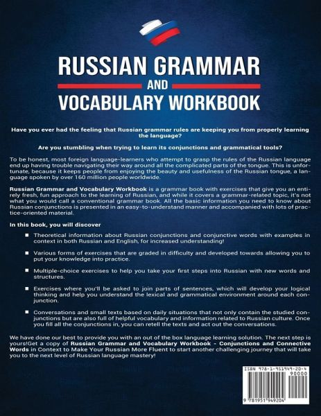 Have you ever had the feeling that Russian grammar rules are keeping you from properly learning the language? Are you stumbling when trying to learn its conjunctions and grammatical tools? To be honest, most foreign language learners who attempt to grasp the rules of the Russian language end up having trouble navigating their way around all the complicated parts of the tongue. This is unfortunate, because it keeps people from enjoying the beauty and usefulness of the Russian tongue, a language spoken by over 160 million people worldwide. Russian Grammar and Vocabulary Workbook is a grammar book with exercises that give you an entirely fresh, fun approach to the learning of Russian, and while it covers a grammar-related topic, it's not what you would call a conventional grammar book. All the basic information you need to know about Russian conjunctions is presented in an easy-to-understand manner and accompanied with lots of practice-oriented material. In this book, you will discover: · Theoretical information about Russian conjunctions and conjunctive words with examples in context in both Russian and English, for increased understanding! · Various forms of exercises that are graded in difficulty and developed towards allowing you to put your knowledge into practice. · Multiple-choice exercises to help you take your first steps into Russian with new words and structures. · Exercises where you'll be asked to join parts of sentences, which will develop your logical thinking and help you understand the lexical and grammatical environment around each conjunction. · Conversations and small texts based on daily situations that not only contain the studied conjunctions but are also full of helpful vocabulary and information related to Russian culture. Once you fill all the conjunctions in, you can retell the texts and act out the conversations. We have done our best to provide you with an out of the box language learning solution. The next step is yours! Get a copy of Russian Grammar and Vocabulary Workbook to start another challenging journey that will take you to the next level of Russian language mastery!