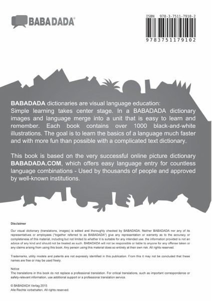 BABADADA dictionaries are visual language education: Simple learning takes center stage. In a BABADADA dictionary images and language merge into a unit that is easy to learn and remember. Each book contains over 1000 black-and-white illustrations. The goal is to learn the basics of a language much faster and with more fun than possible with a complicated text dictionary. This book is based on the very successful online picture dictionary BABADADA.COM, which offers easy language entry for countless language combinations - Used by thousands of people and approved by well-known institutions. The languages used in this book are also called as follows: Russisch, russe, ruso, russo, Rosyjski and Allemand, Alemán, Tedesco, Alemão, Niemiecki