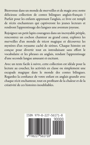 Bienvenue dans un monde de merveilles et de magie avec notre délicieuse collection de contes bilingues anglais-français ! Parfait pour les enfants apprenant l'anglais, ce livre est rempli de récits enchanteurs qui captiveront les jeunes lecteurs et rendront l'apprentissage des langues une aventure joyeuse. Rejoignez un petit lapin courageux dans un incroyable périple, rencontrez un cochon chanteur au grand c¿ur, explorez les merveilles d'un monde de tricot magique et découvrez les mystères d'un royaume caché de sirènes. Chaque histoire est conçue pour divertir tout en introduisant sans effort le vocabulaire et les phrases en anglais, rendant l'apprentissage d'une seconde langue amusant et excitant. Avec un texte facile à suivre, cette collection est idéale pour la lecture au coucher, les activités en classe ou simplement une escapade magique dans le monde des contes bilingues. Regardez la confiance de votre enfant en anglais grandir avec chaque récit enchanteur, tout en profitant de la chaleur et de la créativité de ces histoires inoubliables.