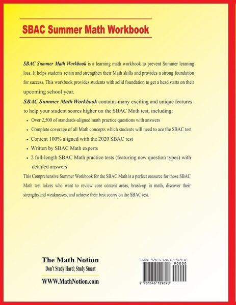 Prepare for the SBAC Math test with a perfect workbook! SBAC Summer Math Workbook is a learning math workbook to prevent Summer learning loss. It helps students retain and strengthen their Math skills and provides a strong foundation for success. This workbook provides students with solid foundation to get a head starts on their upcoming school year. SBAC Summer Math Workbook is designed by top test prep experts to help students prepare for the SBAC Math test. It provides test-takers with an in-depth focus on the math section of the test, helping them master the essential math skills that test-takers find the most troublesome. This is a prestigious resource for those who need an extra practice to succeed on the SBAC Math test in the summer. SBAC Summer Math Workbook contains many exciting and unique features to help your student scores higher on the SBAC Math test, including: * Over 2,500 of standards-aligned math practice questions with answers * Complete coverage of all Math concepts which students will need to ace the SBAC test * Content 100% aligned with the latest SBAC test * Written by SBAC Math experts * 2 full-length SBAC Math practice tests (featuring new question types) with detailed answers This Comprehensive Summer Workbook for the SBAC Math is a perfect resource for those SBAC Math test takers who want to review core content areas, brush-up in math, discover their strengths and weaknesses, and achieve their best scores on the SBAC test. Published By: The Math Notion www.mathnotion.com