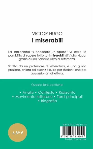 La collezione ¿Conoscere un¿operä offre di sapere tutto su I miserabili di Victor Hugo, grazie a una scheda di lettura tanto completa quanto dettagliata. La scrittura, chiara e accessibile, è stata affidata a uno specialista universitario. Questa scheda di lettura è conforme a una carta di qualità creata da un team d¿insegnanti. La presente guida contiene la biografia di Victor Hugo, la presentazione dell¿opera, il riassunto dettagliato (capitolo per capitolo), le ragioni del suo successo, i temi principali e l¿analisi del movimento letterario dell¿autore.
