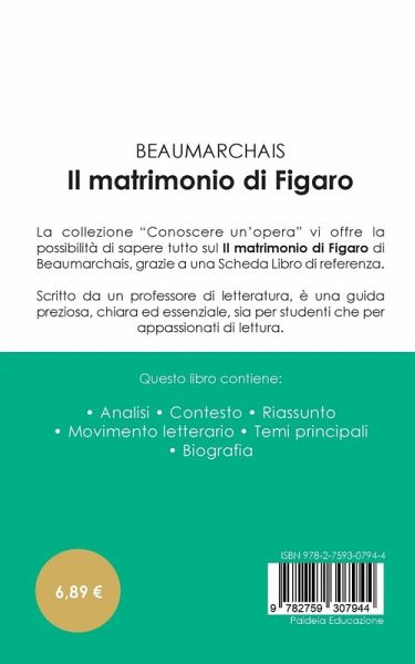La collezione ¿Conoscere un¿operä offre di sapere tutto su Il matrimonio di Figaro di Beaumarchais, grazie a una scheda di lettura tanto completa quanto dettagliata. La scrittura, chiara e accessibile, è stata affidata a uno specialista universitario. Questa scheda di lettura è conforme a una carta di qualità creata da un team d¿insegnanti. La presente guida contiene la biografia di Beaumarchais, la presentazione dell¿opera, il riassunto dettagliato (scena per scena), le ragioni del suo successo, i temi principali e l¿analisi del movimento letterario dell¿autore.