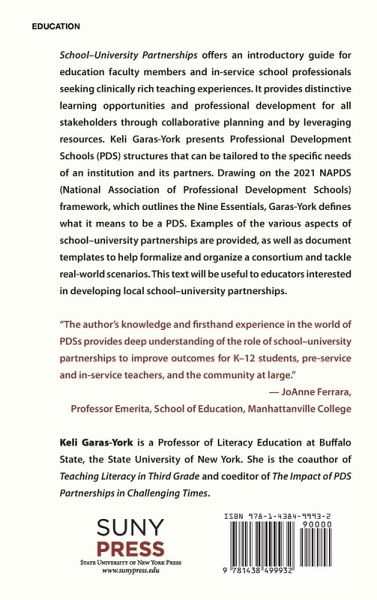 School-University Partnerships offers an introductory guide for education faculty members and in-service school professionals seeking clinically rich teaching experiences. It provides distinctive learning opportunities and professional development for all stakeholders through collaborative planning and by leveraging resources. Keli Garas-York presents Professional Development Schools (PDS) structures that can be tailored to the specific needs of an institution and its partners. Drawing on the 2021 NAPDS (National Association of Professional Development Schools) framework, which outlines the Nine Essentials, Garas-York defines what it means to be a PDS. Examples of the various aspects of school-university partnerships are provided, as well as document templates to help formalize and organize a consortium and tackle real-world scenarios. This text will be useful to educators interested in developing local school-university partnerships.