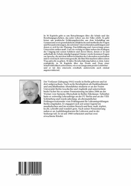 In 36 Kapiteln geht es um Betrachtungen über die Schule und das Beziehungsgeschehen, das jeder Lehrer aus der Nähe erlebt. Es geht ferner um praktische Erfahrungsberichte aus dem Schulalltag am Gymnasium sowie grundsätzliche didaktische und methodische Fragen und Herausforderungen, die sich dem Unterrichtenden aufdrängen und denen er sich bei der Planung, Durchführung und Auswertung seines Unterrichts stellen muß. Und wie wichtig ist dabei neben den Kollegen der Umgang mit seinen Schülern und deren Eltern, denen er in und außerhalb der Schule ständig begegnet! Immer wieder kommen Fragen zur Sprache, die mit dem Selbstverständnis des Lehrenden zu tun haben und es wird nach Antworten gesucht, die ihm Mut machen sollen seinen Weg aufrecht zu gehen. 36 Jahre Berufserfahrung haben es dem Autor ermöglicht, in 36 Kapiteln über das Drum und Dran einer Schulwirklichkeit zu berichten, wie er sie (insgesamt positiv) erlebt hat - und er tut dies einerseits ernsthaft, andererseits auch einmalaugenzwinkernd.