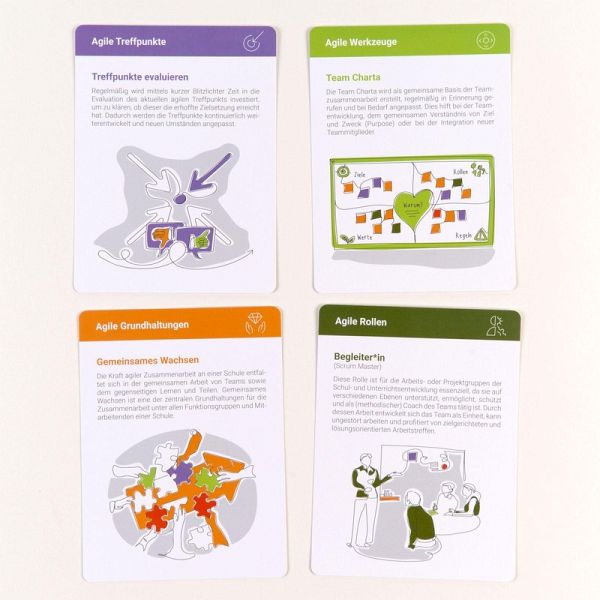 Das Kartenset »Schulen agil entwickeln« ist ein handlicher und nützlicher Begleiter für Schulleitungen, die Veränderungen umsetzen möchten. Unabhängig von der Schulstufe und Schulgröße unterstützen die Karten in der Schulentwicklung, vor allem in der Zusammenarbeit von Teams sowie der Organisation und Planung von Aufgaben. Das Set widmet sich fünf Themengebieten: -Agile Treffpunkte: besonders hilfreiche Formate für Sitzungen und Dienstbesprechungen-Agile Werkzeuge: vielfältige, einfach anwendbare Werkzeuge und Methoden für den Schulleitungsalltag -Agile Rollen: Beschreibung agiler Rollen, übersetzt in den Schulkontext-Agile Grundhaltungen: Haltungen und Verhaltensweisen agiler Zusammenarbeit an einer Schule-neu in der 2. Auflage: vier Phasen agiler SchulentwicklungDie Inhalte sind prägnant beschrieben, mit Beispielen und erklärenden Illustrationen versehen und direkt im Schulleitungsalltag anwendbar. Die Karten können einfach und unabhängig voneinander eingesetzt werden.