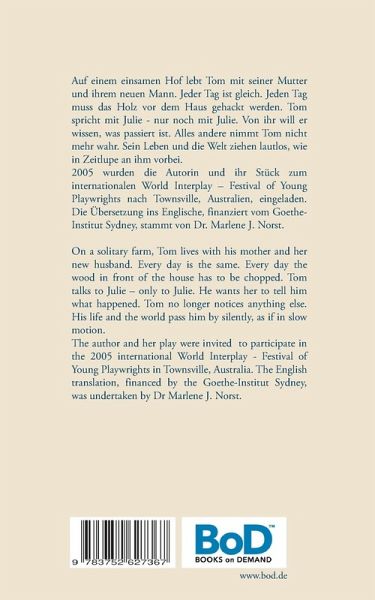 Zweisprachige Buchausgabe eines Theaterstücks: deutsche Version links, englische Übersetzung rechts. Bilingual book edition of a play: German version on the left, English translation on the right.Auf einem einsamen Hof lebt Tom mit seiner Mutter, dem Baby und ihrem neuen Mann. Jeder Tag ist gleich. Jeden Tag muss das Holz vor dem Haus gehackt werden. Tom spricht mit Julie - nur noch mit Julie. Von ihr will er wissen, was passiert ist. Alles andere nimmt Tom nicht mehr wahr. Sein Leben und die Welt ziehen lautlos, wie in Zeitlupe an ihm vorbei. On a solitary farm, Tom lives with his mother, the baby and her new husband. Every day is the same. Every day the wood in front of the house has to be chopped. Tom talks to Julie - only to Julie. He wants her to tell him what happened. Tom no longer notices anything else. His life and the world pass him by silently, as if in slow motion.Als Teil der deutschen Delegation wurden die Autorin und ihr Stück 2005 zum internationalen World Interplay - Festival of Young Playwrights nach Townsville, Australien, eingeladen. Das Goethe-Institut Sydney finanzierte die Übersetzung ins Englische, die Dr. Marlene J. Norst vornahm. As part of the German delegation, the author and her play were invited to participate in the 2005 international World Interplay - Festival of Young Playwrights in Townsville, Australia. The Goethe-Institut Sydney financed the English translation of the work, which was undertaken by Dr Marlene J. Norst.