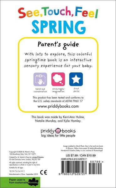 Your baby can explore the joys of Spring with Roger Priddy's sturdy sensory book, See, Touch, Feel: Spring. It's specially designed to stimulate babies with colorful pictures, activities, textures to feel and finger trails to follow. These fun, simple, Spring-themed activities encourage babies to interact with the book through sight, sound and touch. As your baby grows, See, Touch, Feel: Spring will help them to develop early language recognition and motor skills. With lots of bright pictures and engaging novelties to enjoy together, this is the perfect sensory experience to share with your little one.