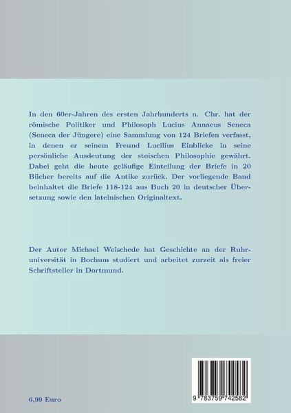 In den 60er-Jahren des ersten Jahrhunderts n.Chr. hat der römische Politiker und Philosoph Lucius Annaeus Seneca (Seneca der Jüngere) eine Sammlung von 124 Briefen verfasst, in denen er seinem Freund Lucilius Einblicke in seine persönliche Ausdeutung der stoischen Philosophie gewährt. Dabei geht die heute geläufige Einteilung der Briefe in 20 Bücher bereits auf die Antike zurück. Der vorliegende Band beinhaltet die Briefe 118-124 aus Buch 20 in deutscher Übersetzung sowie den lateinischen Originaltext.