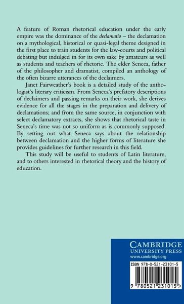 A feature of Roman rhetorical education under the early empire was the dominance of the declamatio - the declamation on a mythological, historical or quasi-legal theme designed in the first place to train students for the law courts and political debating but indulged in for its own sake by amateurs as well as students and teachers of rhetoric. The elder Seneca, father of the philosopher and dramatist, compiled an anthology of the often bizarre utterances of the declaimers. Janet Fairweather's 1981 book is a detailed study of the anthologist's literary criticism. From Seneca's prefactory descriptions of declaimers and passing remarks on their work, she derives evidence for all the stages in the preparation and delivery of declamations; and from the same source, in conjunction with select declamatory extracts, she shows that rhetorical taste in Seneca's time was not so uniform as is commonly supposed.