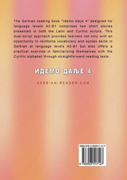 Delve into the world of Serbian language learning with the reader "Idemo dalje 4," tailored for language levels A2 - B1 (Intermediate Low / Mid / High). This engaging resource features two short stories presented as reading texts, skillfully composed in both Serbian alphabets - Latin and Cyrillic. Beyond merely honing vocabulary and syntax for speaking levels A2 - B1, learners also benefit from a valuable exercise in mastering the Cyrillic alphabet. Linguistically, the texts and topics are meticulously adapted to suit the grammatical nuances of language levels A2 - B1, aligning with the Common European Framework of Reference for Languages (CEFR). To enhance comprehension and serve as a helpful reference, the book opens with a table showcasing the Serbian Cyrillic alphabet. Moreover, a comprehensive vocabulary list in Serbian - English awaits at the book's conclusion, providing learners with additional support for reinforcing language skills. "Idemo dalje 4" not only facilitates language development but also fosters a nuanced understanding of Serbian at an intermediate proficiency level. Introducing a new addition to the "IDEMO DALJE" series, this reading book is a valuable component of the SERBIAN READER collection. As part of a comprehensive series, "IDEMO DALJE" encompasses textbooks, reading materials, audio books, interactive e-books, videos, and other media resources, providing a holistic approach to learning Serbian as a foreign language. For a deeper exploration of this book series and other publications dedicated to mastering the Serbian language, visit our homepage.