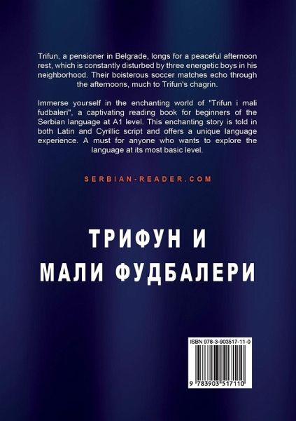 Trifun, a pensioner in the heart of Belgrade whose simple desire is for an afternoon rest, has his peace disturbed by three lively boys in his neighborhood with their spirited game of soccer. An inevitable confrontation ensues as both parties feel the other should give in and be more understanding. - This enchanting story is not only an enjoyable read, but also a seamless way to improve your language skills. Immerse yourself in the narrative, where cultural and linguistic nuances blend harmoniously. Embark on a linguistic journey with this captivating book in the second edition, where the story unfolds in the dual beauty of both Serbian scripts: Latin and Cyrillic. Designed for learners at the A1 level, equivalent to Novice Low/Mid/High proficiency, this narrative not only immerses you in the rich vocabulary and syntax of the Serbian language but also guides you through the intricacies of the Cyrillic alphabet. Introducing a new addition to the "IDEMO DALJE" series, this reading book is a valuable component of the SERBIAN READER collection. As part of a comprehensive series, "IDEMO DALJE" encompasses textbooks, reading materials, audio books, interactive e-books, videos, and other media resources, providing a holistic approach to learning Serbian as a foreign language. For a deeper exploration of this book series and other publications dedicated to mastering the Serbian language, visit our homepage.