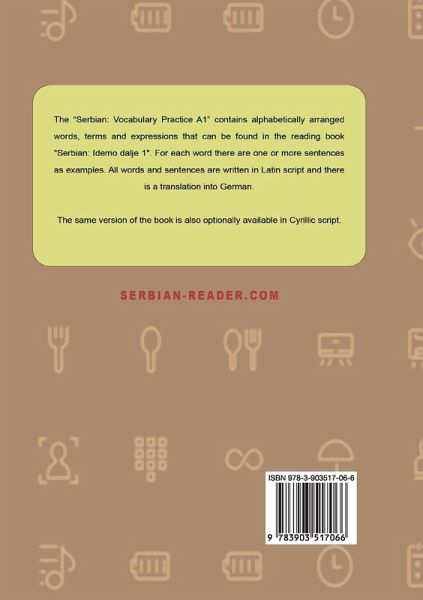 The 2nd edition of the textbook Serbian: Vocabulary Practice A1 to the book 'Idemo dalje 1' (Language Level A1 - Beginner) was developed as a supplement to the reading book "Serbian: Idemo dalje 1". The vocabulary practice contains alphabetically arranged words, terms and expressions that can also be found in the reading book, and for each word there is one or more sentences as an example. All words and phrases are written in Latin script and a translation into English is available for all words and phrases. The vocabulary practice can also be used independently of the rest of the accompanying material, as a stand-alone reading or as a reference book when learning Serbian. The same version of the book is also optionally available in Cyrillic script. For more information about this and other books in the "Serbian Reader" series, please visit our homepage. Level A1-Beginner (GERS) = Novice Low / Mid (ACTFL)