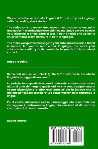 Short Stories in English/Italian - Parallel TextUnlock Ignite & Transform Your Language Skills with Contemporary Romance Welcome to the series Unlock Ignite & Transform your language skills by reading short stories. The series aims to unlock the power of your subconscious mind and assist in resurfacing those abilities that have always been at your disposal. It offers parallel text in both English and Italian to enjoy contemporary literature in both languages. The more you get the message to your subconscious mind that it is normal to read either language, the more your subconscious will try to demonstrate that this is indeed correct. The eighth short story in the series is London Calling. Gabrielle was away from the Paris office more and more, and working from home had started to creep in. From the London home. London was calling, calling to write the next chapter of her story with him, and only him. For Gabrielle had played, had strayed, and now she was ready to stay. Happy reading! ----------------------------------------------- Benvenuti alla series Unlock Ignite & Transforma le tue abilità linguistiche leggendo racconti. La serie ha lo scopo di sbloccare il potere del vostro subconscio e aiutarvi a far riemergere quelle abilità che sono sempre state a vostra disposizione e offre testi paralleli sia in inglese che in italiano per godersi la letteratura contemporanea in entrambe le lingue. Più il vostro subconscio riceve il messaggio che è normale per voi leggere in entrambe le lingue, più cercherà di dimostrarvi che questo è davvero corretto. L'ottavo racconto incluso in questo serie è Londra Chiama. Gabrielle era sempre più lontana dall'ufficio di Parigi e aveva iniziato a insinuarsi il lavoro da casa. Dalla casa di Londra. Londra stava chiamando, chiamando per scrivere il prossimo capitolo della sua storia con lui, e solo con lui. Perché Gabrielle aveva giocato, si era allontanata e ora era pronta a restare. Buona lettura!