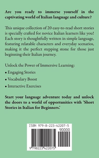 Are you ready to immerse yourself in the captivating world of Italian language and culture? This unique collection of 20 easy-to-read short stories is specially crafted for novice Italian learners like you! Each story is thoughtfully written in simple language, featuring relatable characters and everyday scenarios, making it the perfect stepping stone for those just beginning their Italian journey. Unlock the Power of Immersive Learning: • Engaging Stories: Delve into delightful narratives that will transport you to various Italian-speaking regions, enhancing your language and cultural awareness. • Vocabulary Boost: Each story is accompanied by a handy vocabulary list to help you master essential Italian words and phrases with ease. • Interactive Exercises: Test your understanding and reinforce your learning with thought-provoking exercises that cater to all learning styles. Take Your Italian Skills to the Next Level: Whether you are a complete beginner or seeking to level up your language proficiency, 'Short Stories in Italian for Beginners' offers an enriching learning experience. Join countless learners who have already benefited from this invaluable resource, and embark on a journey that will boost your reading and listening comprehension skills while having fun! Start your language adventure today and unlock the doors to a world of opportunities with 'Short Stories in Italian for Beginners.' Grab your copy now and immerse yourself in the beauty of Italian language and culture!"
