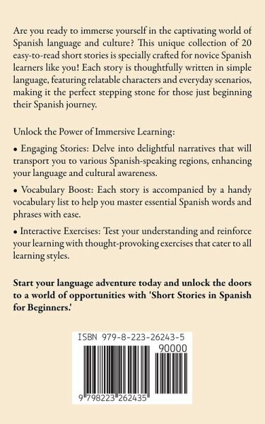 "Short Stories in Spanish for Beginners" is a collection of 20 easy-to-read short stories designed for novice Spanish learners. The stories are written in simple language and feature relatable characters and everyday situations, making them ideal for those who are just starting to learn the language. Each story is followed by a series of a vocabulary list and exercises, enabling readers to check their understanding and expand their knowledge of Spanish vocabulary and grammar. The book also includes audio recordings of each story, allowing readers to practice their listening skills and improve their pronunciation. Whether you are learning Spanish for the first time or looking to improve your reading and listening comprehension skills, "Short Stories in Spanish for Beginners" is a valuable resource for anyone interested in learning the language in a fun and engaging way.